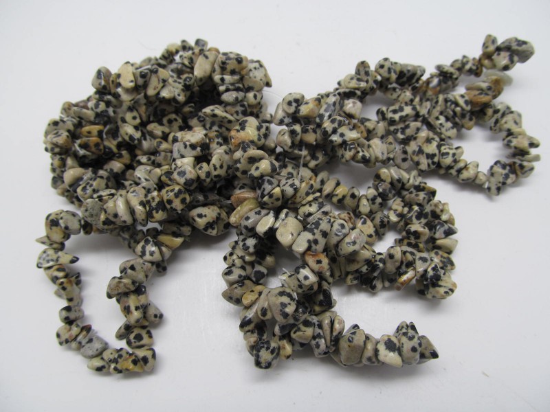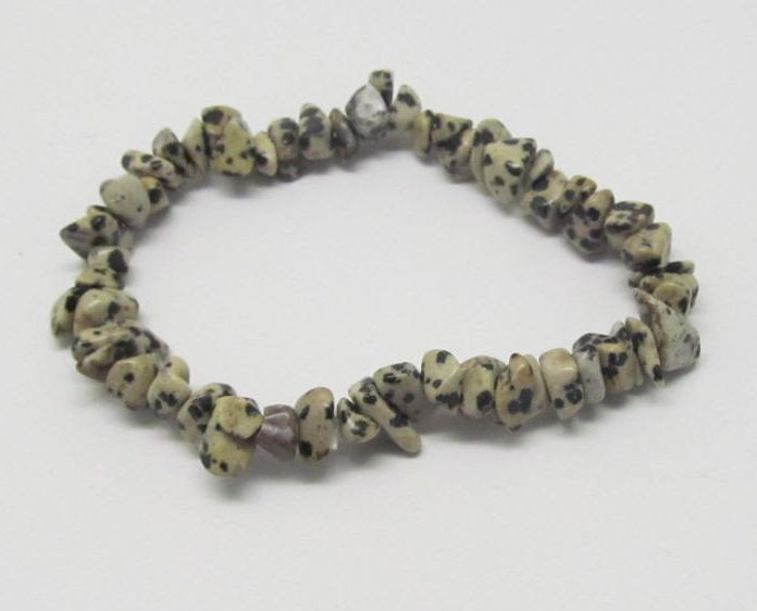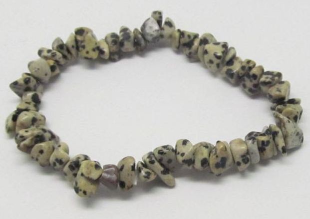 Náramek z tromlovaných kousků dalmatinového jaspisu. Universální velikost na gumičce. Cena je za kus nebo cenově výhodnější velkoobchodní balení 10 ks těchto náramků.