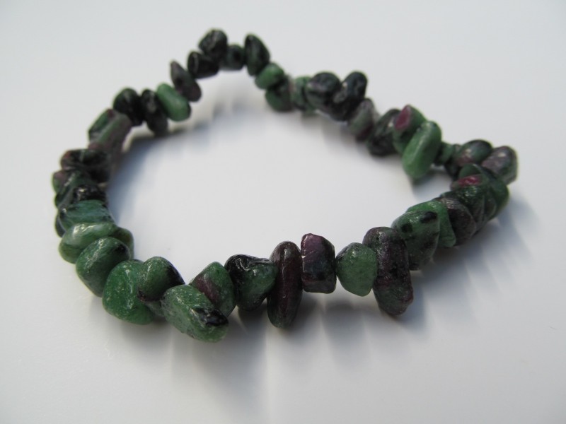 Náramek z tromlovaných kousků pravého rubínu v zoisitu z Tanzánie. Universální velikost na gumičce. Cena je za kus nebo cenově výhodnější velkoobchodní balení 10 ks těchto náramků.