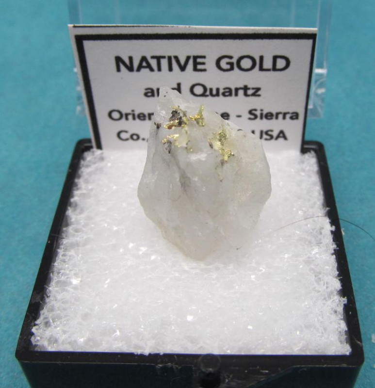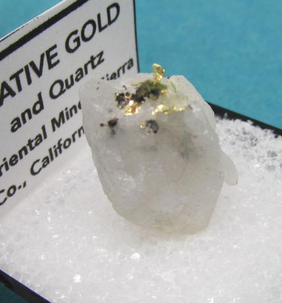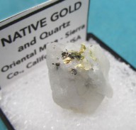 Native Gold on quartz from Oriental Mine in California, USA. Size specimen is 20x15x15 mm.