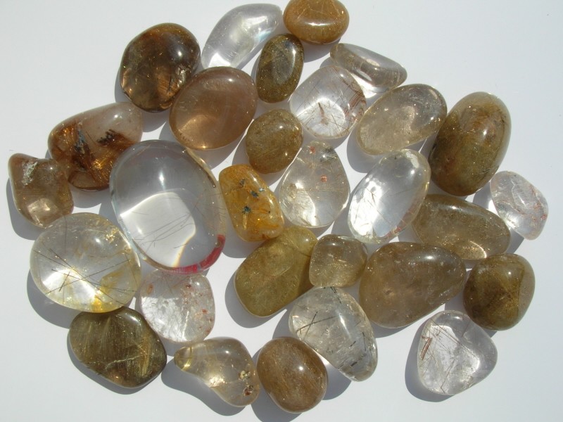 Tromlovaný rutil-sagenit v křišťálu z Brazílie.Cena za 1 kus velikosti S- 1 cm, M- 1,5 cm, L - 2 cm nebo velikosti XL - 3 cm nebo 0,5 kg mix těchto dvou velikostí.