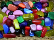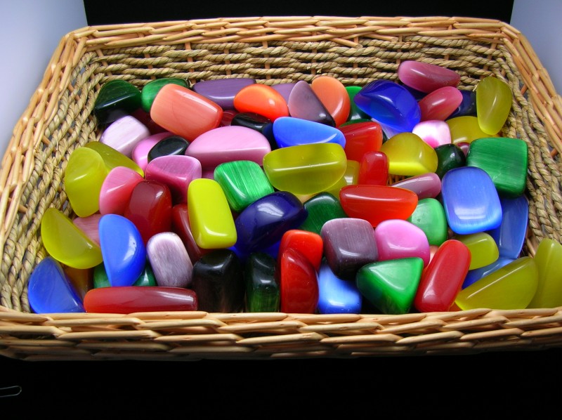 Tromlovaný ulexit - kočičí oko - syntetický kámen, 5 kg balení mix šesti barev. Kus je velikosti ca.50 gr./kus tj. asi 5x3 cm. Celkem je v tomto v balení asi 100 ks těchto kamenů.