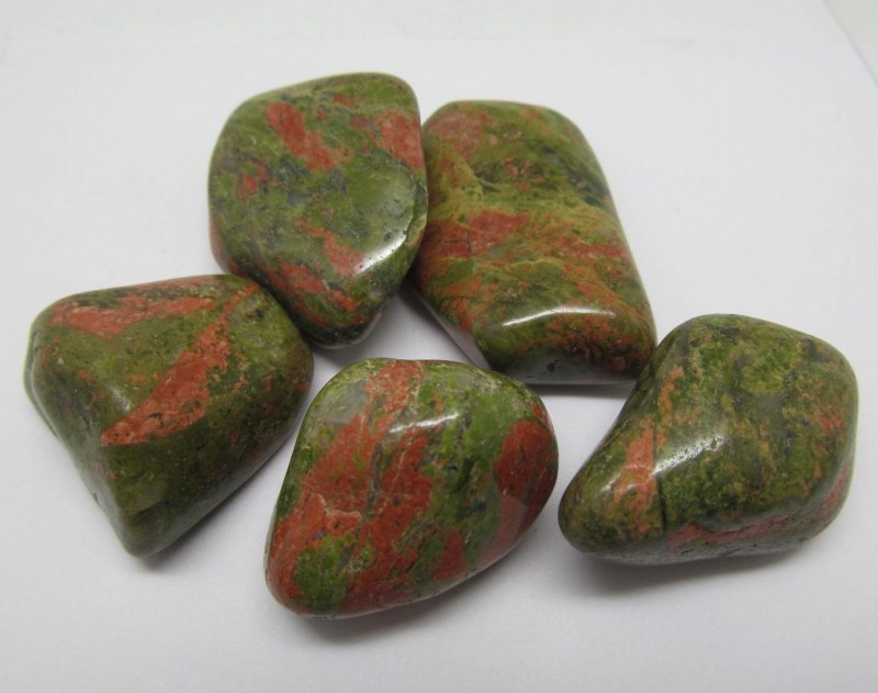 Tromlovaný unakit z Afriky. Jedntlivě cena je za 1 kus velikosti L - asi 2x2 cm nebo XL - asi 3x3 cm. Velikosti balené po 1 kg sáčcích L= 2 cm/kus a asi 80 kamínků, XL= 3 cm/kus a asi 50 kamínků v kg. Je možné objednat i cenově nejvýhodnější balení 5 kg.